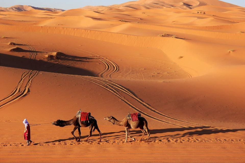 Nous rejoignons la route principale et nous nous dirigeons vers l’est, en passant par Erfoud et Rissani, le berceau de la dynastie alaouite. Peu de temps après, vous aurez une première vue sur les dunes de Merzouga. Profitez d’une balade à dos de chameau au coucher du soleil dans la soirée. Passez la nuit dans une auberge au milieu des grandes dunes. Vous pouvez même faire une balade à dos de chameau jusqu’aux grandes dunes pour une soirée et une nuit de bivouac.