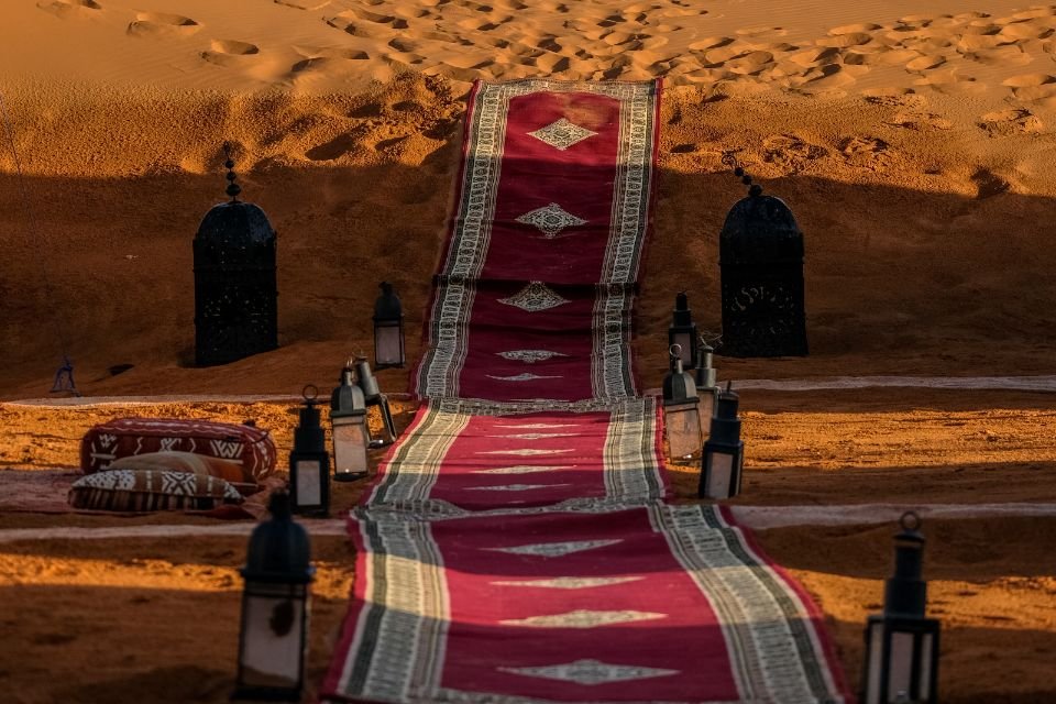 Avec six palmeraies et des vues lunaires le long des sentiers présahariens. Enfin, nous arrivons à Zagora, un petit village sur le territoire ancestral de la dynastie Saadienne. C’est là que nous passerons la première nuit de notre aventure. Dîner et nuit dans un bivouac Zagora.